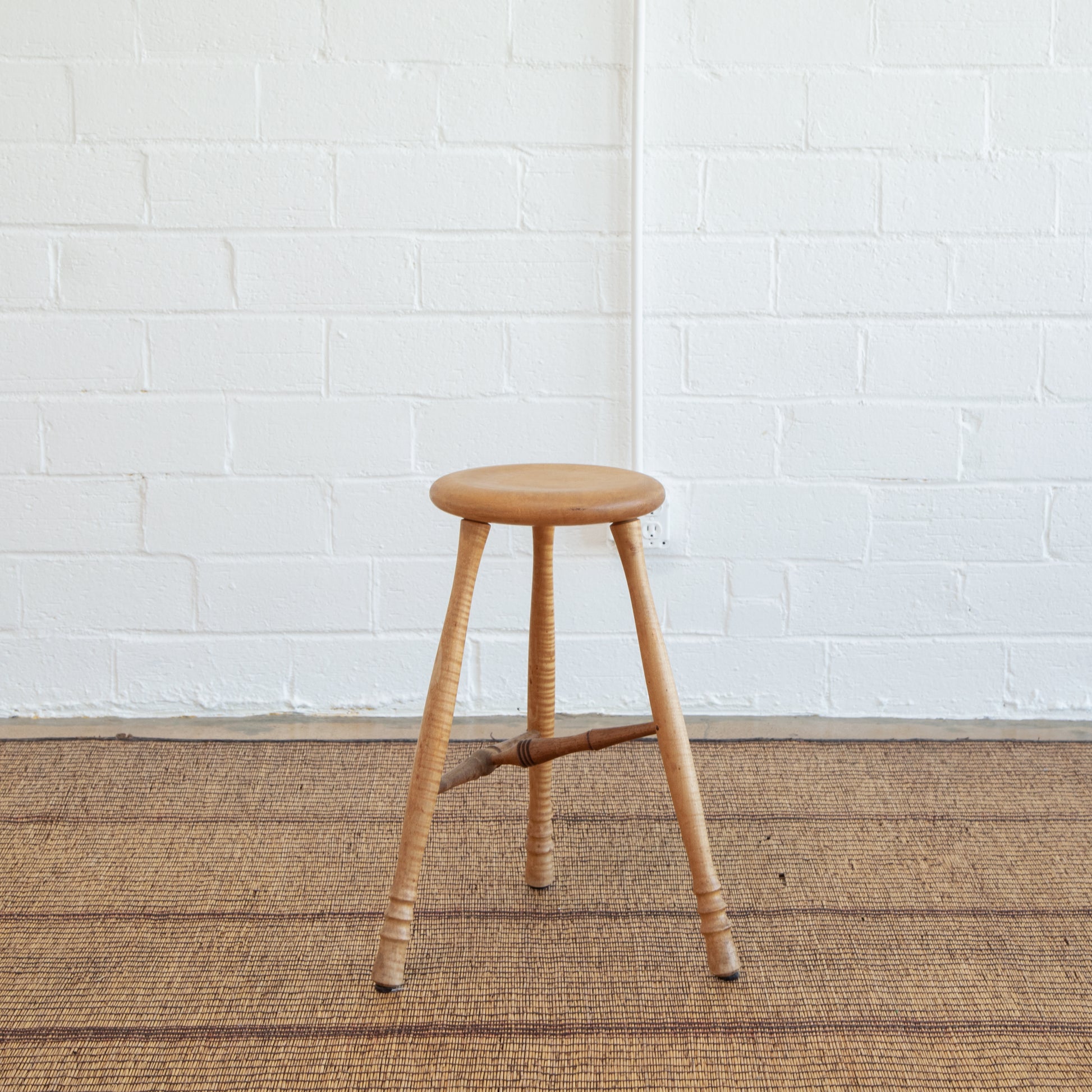 Three spindle legs with round seat. "T-shaped" stretcher with turned details.